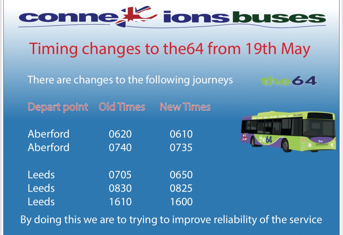 We've got some slight changes to the64 times to try and improve the reliability. These are from 19th may and affect the journeys listed on the notice above